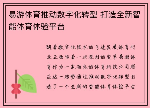 易游体育推动数字化转型 打造全新智能体育体验平台